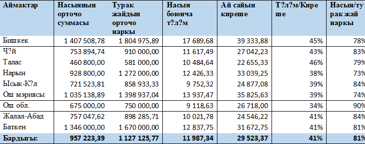 Насыя үчүн төлөөнүн орточо алынган суммасын аймактар боюнча караганда: