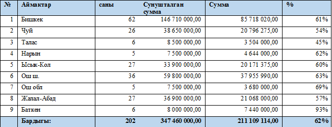 Жалпы тизмеге ылайык Программанын республика боюнча катышуучуларынын саны 4 684 адамдан турат. Учурда банктар тарабынан берилген насыяларды аймактар боюнча караганда, төмөнкүдөй: