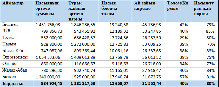 Насыя үчүн төлөөнүн орточо алынган суммасын аймактар боюнча караганда:
