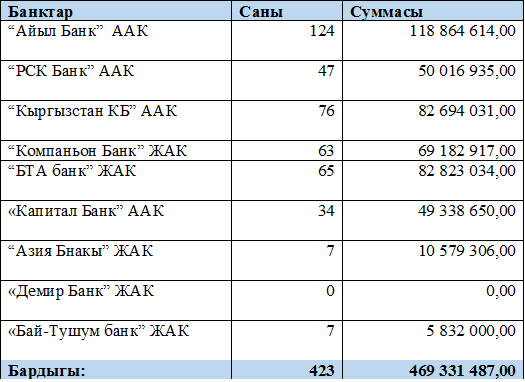 2016-жылдын 27-октябрына карата абал боюнча коммерциялык банктар аркылуу берилген ипотекалык насыялар тууралуу маалымат: