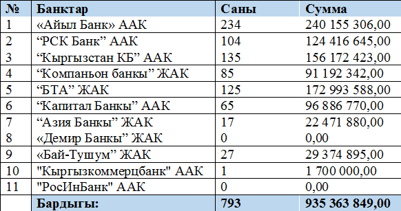 2017-жылдын 2-февралына карата абал боюнча коммерциялык банктар аркылуу берилген ипотекалык насыялар тууралуу маалымат: