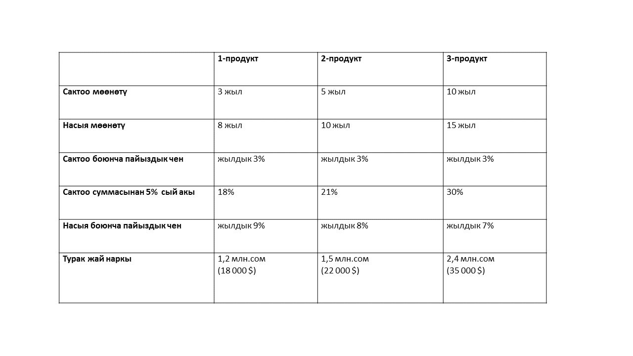 Контрактык турак жай аманат механизминин чегинде бериле турган продукттардын болжолдуу параметрлери төмөндө келтирилген: