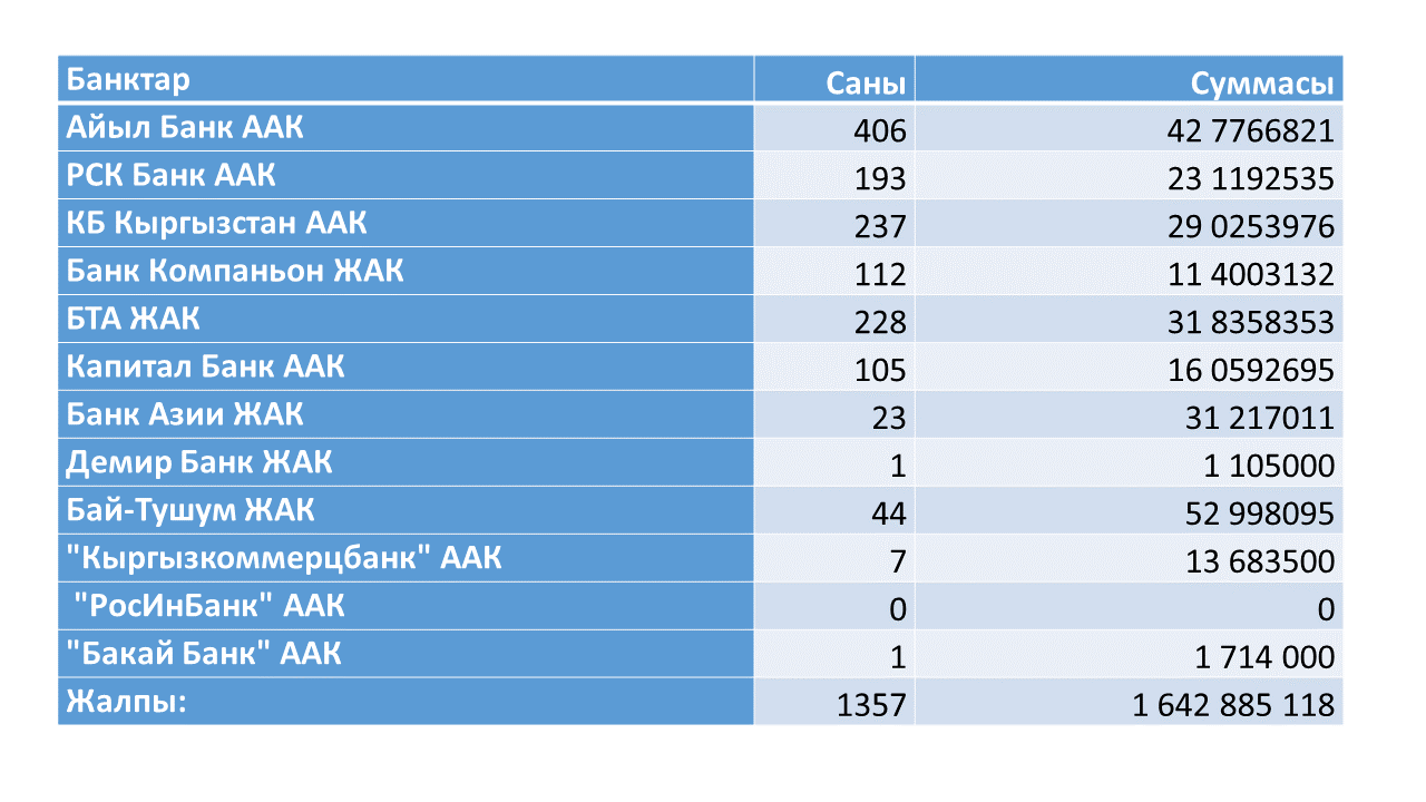 2017-жылдын 30-июлуна карата абал боюнча коммерциялык банктар аркылуу берилген ипотекалык насыялар тууралуу маалымат: