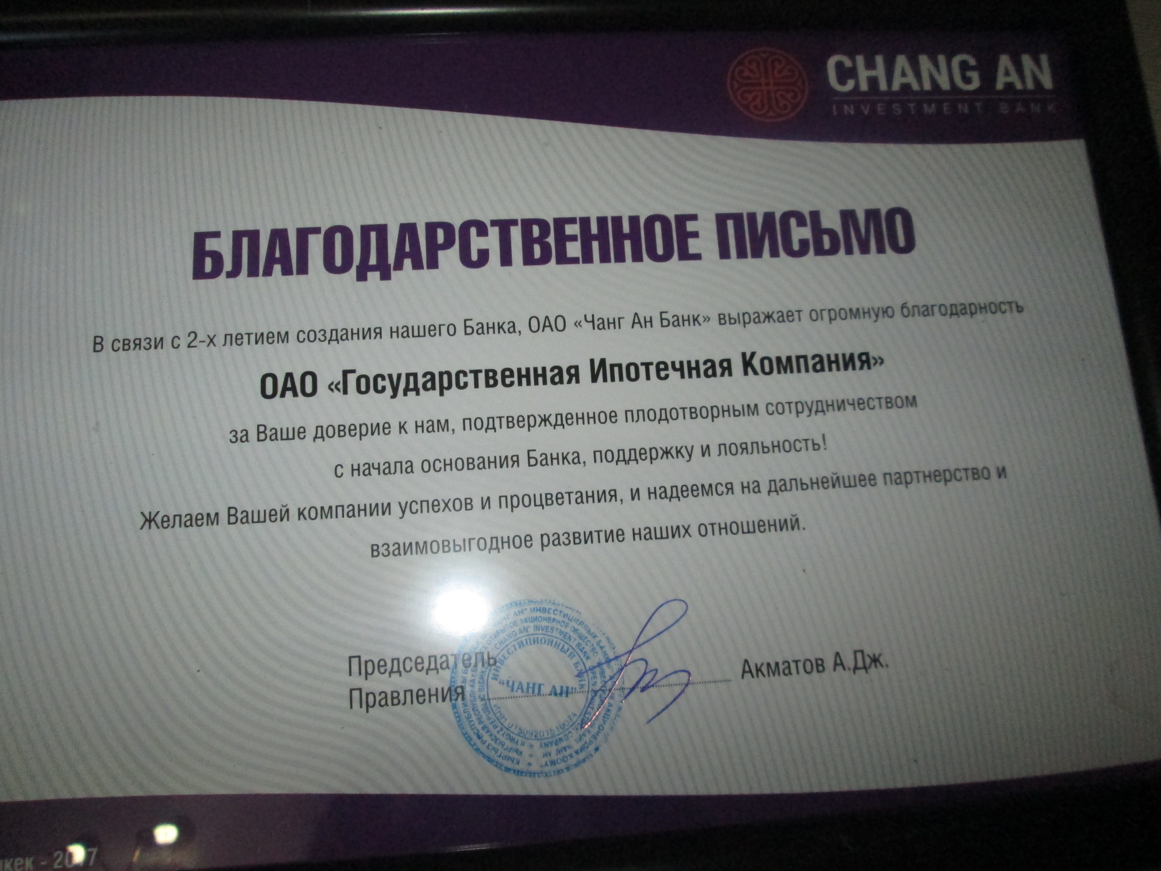 “Чанг Ан” Инвестициялык Банкы бүгүн өзүнүн уюшулуп иштеп жаткандыгынын 2 жылдыгын белгиледи. Аталган банк Кыргыз Республикасынын Өкмөтүнүн “Арзан турак жай 2015-2020” программасынын алкагында “МИК” ААК менен кызматташууда аз убакыт болгонуна карабай, бул багытта жакшы жылыштар менен ишин улантып жатат. Атап айтсак Программанын алкагында ипотекалык насыяны “Чанг Ан” Инвестициялык Банкы маржаны 4,5% өлчөмүндө белгилөө менен баштаган. Аталган банк өзүнүн 2 жылдык мааракесинде МИК менен кызматташып жатканына ыраазычылык иретинде МИК дарегине жана жетекчилигине алкыш ыраазычылыктарын төмөнкүдөй билдиришти.