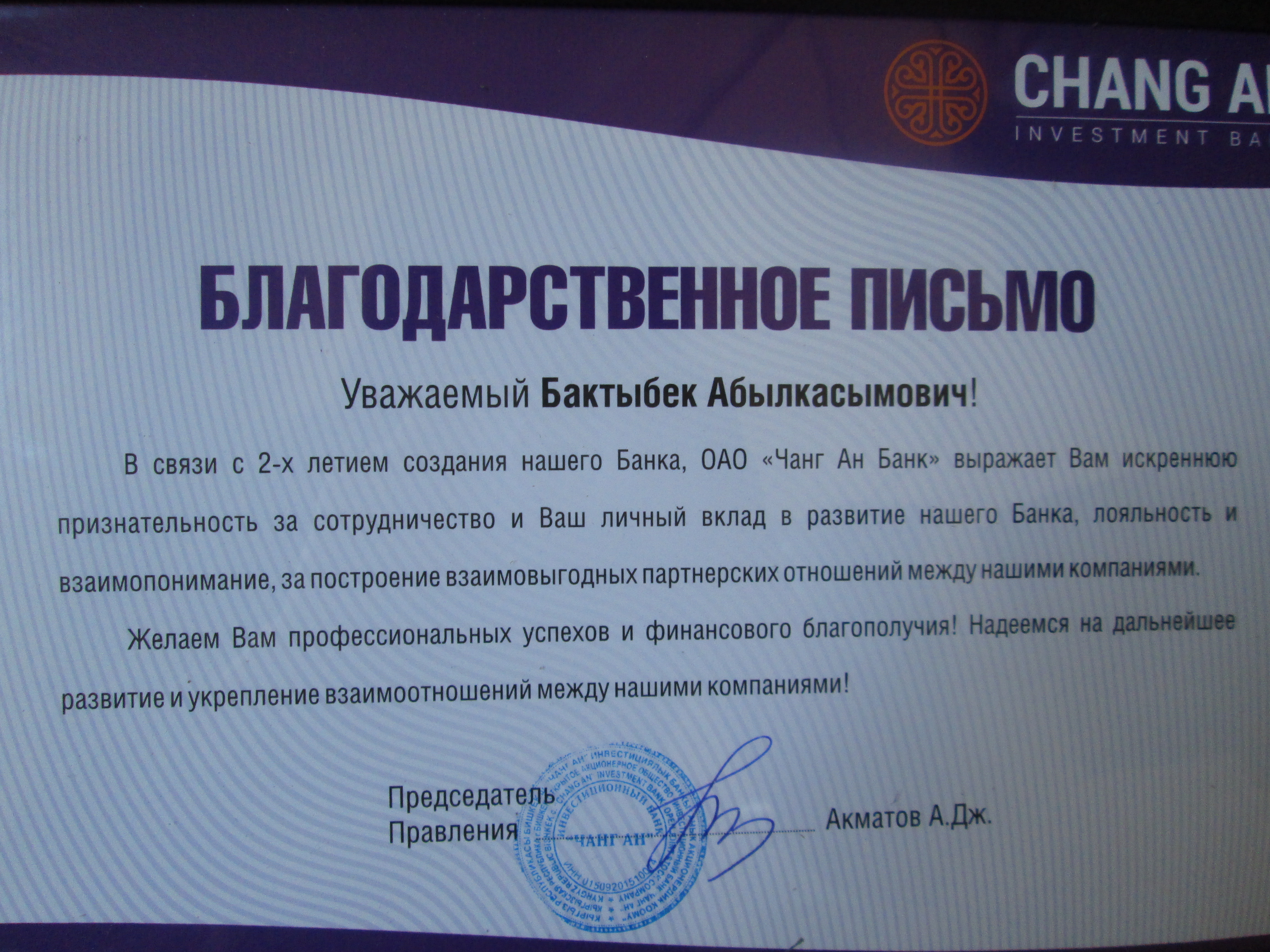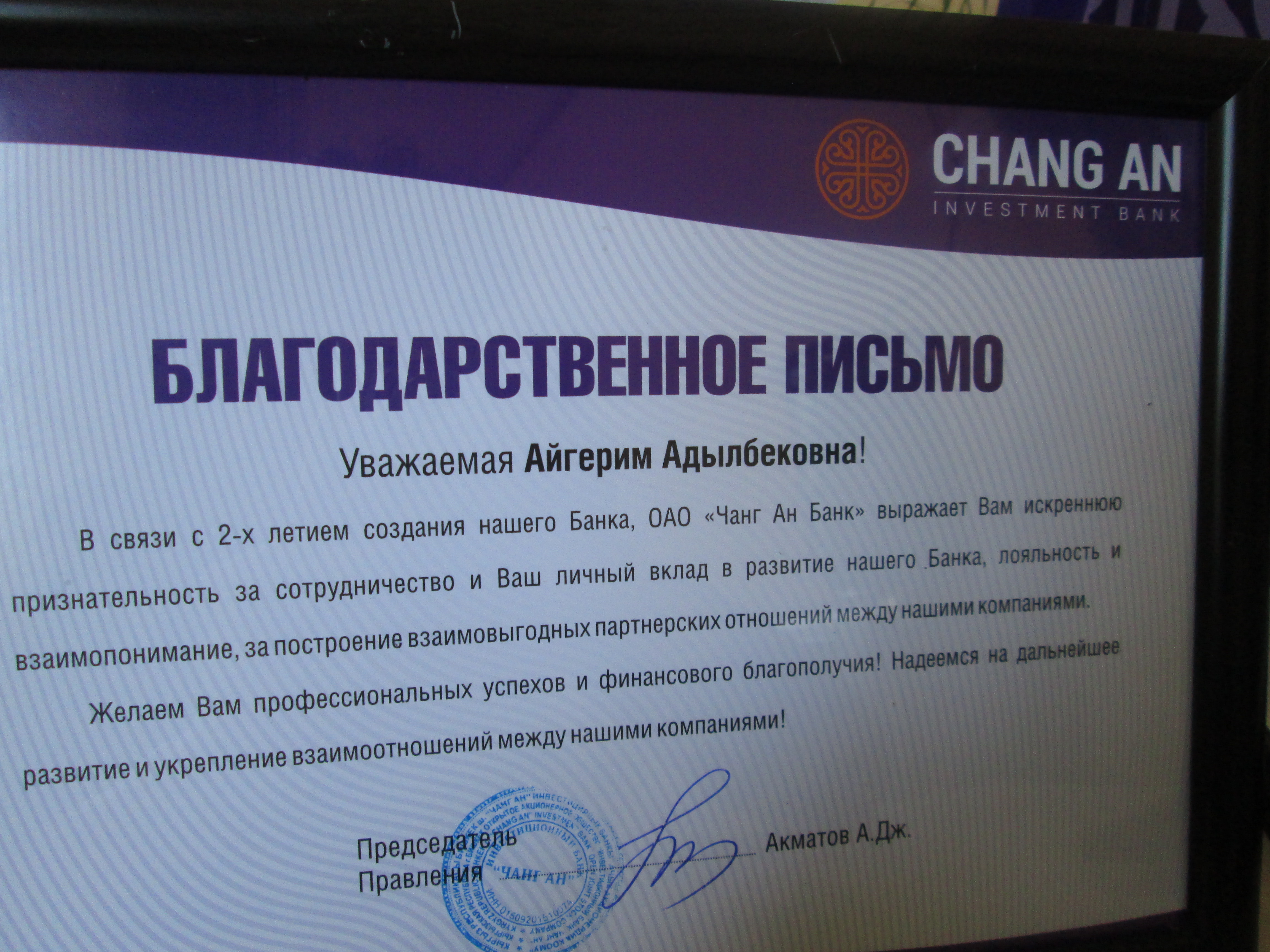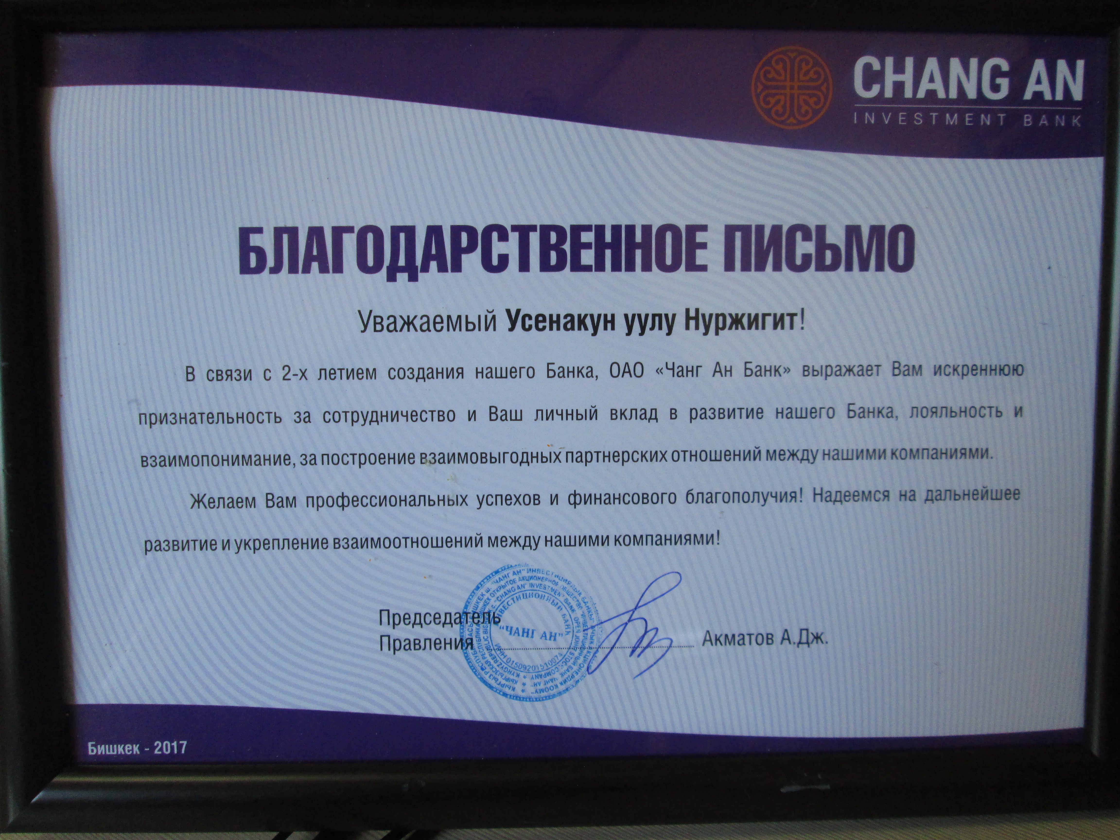 “Чанг Ан” банкы ыраазычылык билдирди!