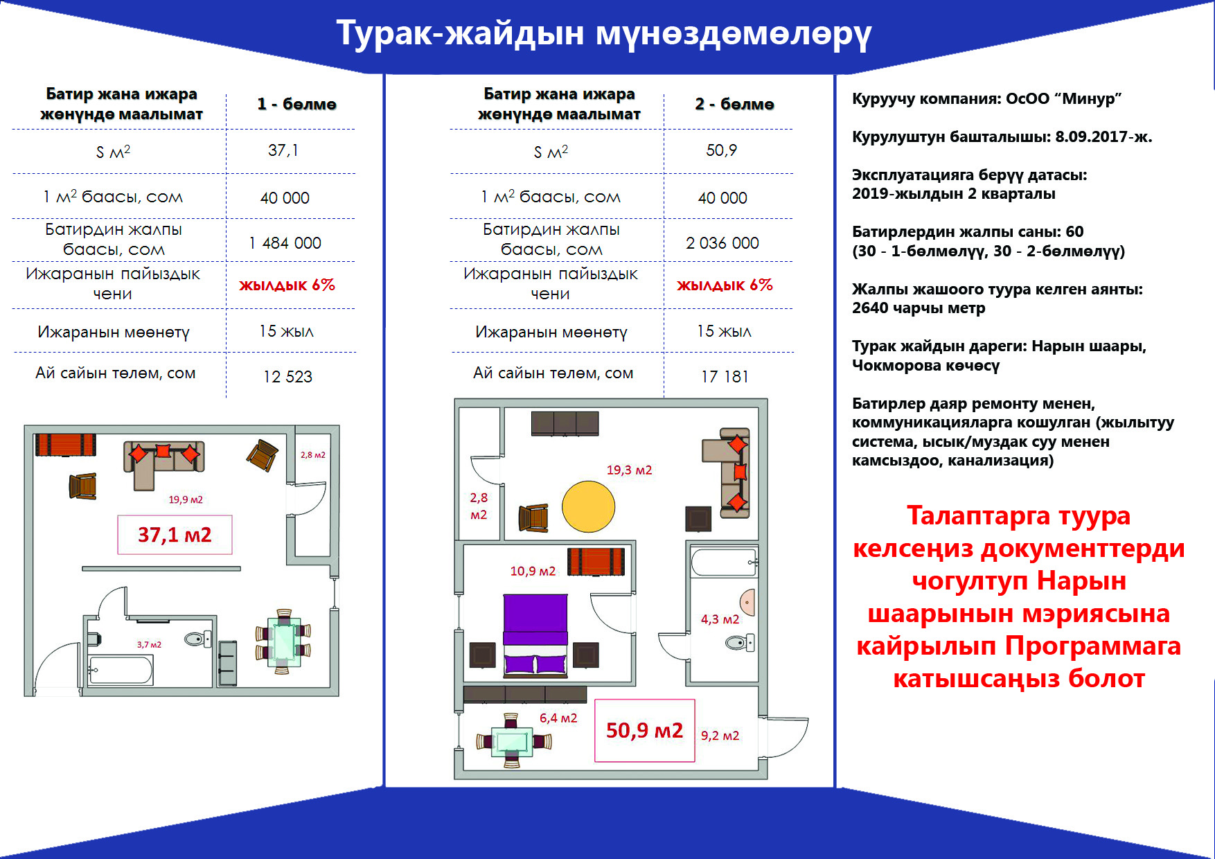Батирлер бюджеттин мекемелердин гана өкүлдөрүнө ижара менен сатып алуу механизмы менен берилет.(бир жана эки бөлмөлүү батирлер)