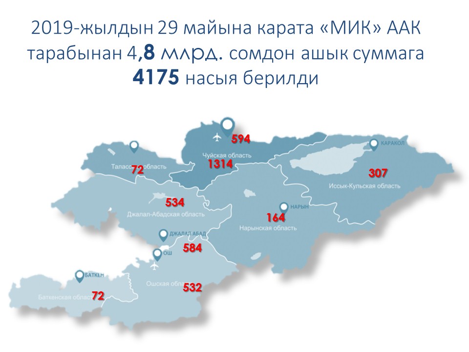 2019-жылдын 29 майына карата "МИК" ААК тарабынан 4,8 млр.сомдон ашык суммага 4175 насыя берилди.