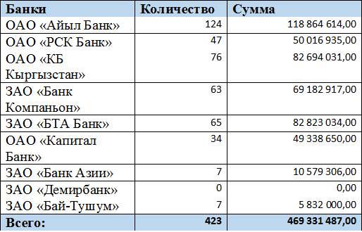 До сегодняшнего дня ипотечный кредит по условиям ГИК можно было получить в девяти коммерческих банках республики: ОАО «РСК Банк», ОАО «Айыл Банк», ЗАО «Бай-Тушум», ЗАО «Демирбанк», ЗАО «Банк Компаньон», ОАО «КБ Кыргызстан», ЗАО «Банк Азии», «Capital Bank Центральной Азии», ЗАО «БТА Банк».