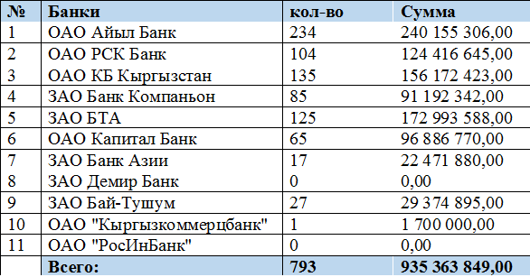 До сегодняшнего дня ипотечный кредит по условиям ГИК можно было получить в одиннадцати коммерческих банках республики: ОАО «РСК Банк», ОАО «Айыл Банк», ЗАО «Банк Компаньон», ОАО «КБ Кыргызстан», ЗАО «Банк Азии», «Capital Bank Центральной Азии», ЗАО «БТА Банк», ЗАО «Банк Бай-Тушум», ЗАО «Демир Кыргыз Интернэшнл Банк», ОАО «Кыргызкоммерцбанк», ОАО «Росинбанк».