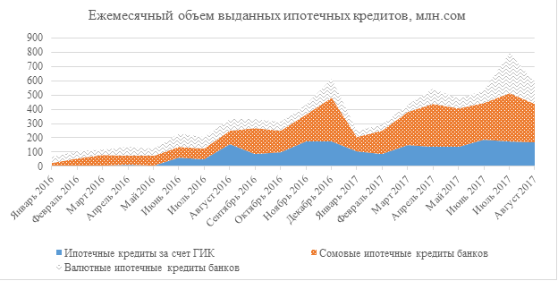 В Кыргызской Республике объем выданных всех ипотечных кредитов и в национальной, и в иностранной валюте за 8 месяцев текущего года составил 3 917,3 млн. сомов. Этот объем выдачи в 3 раза превышает объем выданных кредитов за аналогичный период прошлого года, в котором объем выдачи составил 1 317 млн. сомов. За 8 месяцев 2017 года объем выданных ипотечных кредитов за счет средств ГИК составил 1 141,9 млн.сомов, что составляет 29% всех ипотечных кредитов в КР и 37% ипотечных кредитов в национальной валюте, выданных в этом периоде.