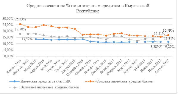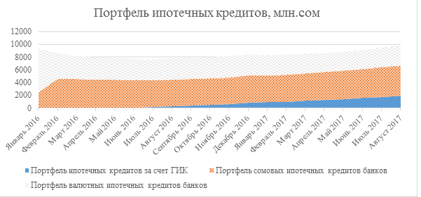 Совокупный портфель ипотечных кредитов и в национальной и иностранной валюте, выданный банковской системой КР на 31 августа 2017 года составил 9 814,3 млн.сомов, увеличившись на 20% по сравнению с началом года. Наблюдается медленный, но постоянный рост портфеля по ипотечным кредитам за счет ГИК и на 31 августа 2017 года составил 20% всего портфеля ипотечных кредитов банковской системы. Доля банковских ипотечных кредитов в национальной валюте составила 49 %, а доля ипотечных кредитов в иностранной валюте составила 32% всех ипотечных кредитов в КР.