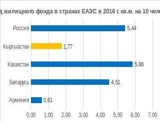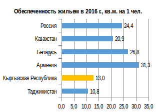 Показатель обеспеченности населения жильем в республике за прошедшие 10-12 лет кардинально не изменился. Показатель обеспеченности населения жильем в 2016 году по республике составил 13 кв.м. на 1 человека: 14,5кв.м. в городской местности и 12,3 кв.м. в сельской местности. В других странах ЕАЭС показатель обеспеченности населения жильем выше чем в нашей республике, из них в Армении - самый большой показатель обеспеченности жильем 31 кв.м.