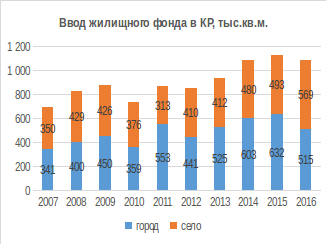 Низкий уровень обеспеченности жильем в нашей республике связан, с низким уровнем ввода жилищного фонда, а также с государственной инвентаризацией жилого фонда, в ходе которого периодически выводится из жилищного фонда определенная часть жилья из-за амортизации и износа как это было в 2010-2013 годах. В тоже время, ежегодно в республике вводится в среднем около 917 тыс.кв.м. жилищного фонда или около 0,2 кв.м. на одного человека (от общей численности населения), что в 5 раз ниже, например, европейского стандарта по строительной активности, который должен составлять не менее 1 кв. м на человека в год. При таком уровне стандарта можно оптимально удовлетворять потребности граждан в жилье, обновлять жилищный фонд и обеспечивать насыщение рынка. По показателю ввода жилищного фонда в 2016 году Кыргызстан опережал только Армению. Но в Армении, как было показано в предыдущей диаграмме - самый высокий показатель обеспеченности жильем среди стран ЕАЭС, и поэтому необходимости в большом вводе жилищного фонда там не существует. Около 80% вводимого жилья в Кыргызской республике возводится за счет средств населения: