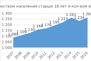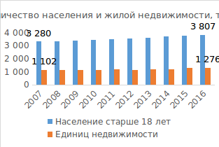 1-й метод расчетадефицита жилищного фонда по единице недвижимости, приходящейся на трудоспособное население. С каждым годом увеличивается разница между количеством единиц жилья и численностью совершеннолетнего населения. Так за 10 лет количество населения старше 18 лет увеличилось на 527 тыс. чел., тогда как количество единиц жилой недвижимости увеличилось всего на 174 тыс. единиц. На начало 2007 года на население старше 18 лет в 3280 тыс. чел. приходилось количество недвижимости в 1102 тыс. единиц, и разница между ними составляла 2178 тыс. единиц, тогда как в 2016 году на совершеннолетнее население в 3 807 тыс. человек приходится 1276 тыс. ед. недвижимости, разница составляет 2531 тыс.