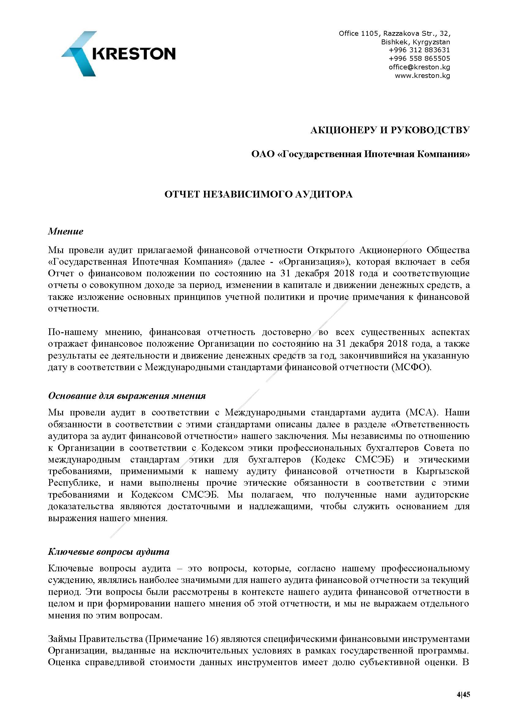 Независимая международная аудиторская компания «KRESTON» завершила аудит финансово-хозяйственной деятельности ОАО «Государственная Ипотечная Компания» за 2018 год, подтвердив достоверность финансовых отчетов, соответствие их результатам деятельности за указанный период и финансовое положение компании по состоянию на 31 декабря 2018 года.