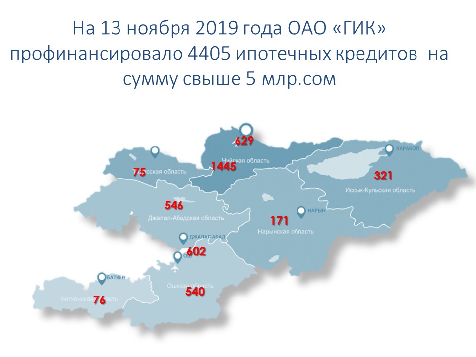 На 13 ноября 2019 года ОАО "ГИК" профинансировало 4405 ипотечных кредитов на сумму свыше 5 млр.сом