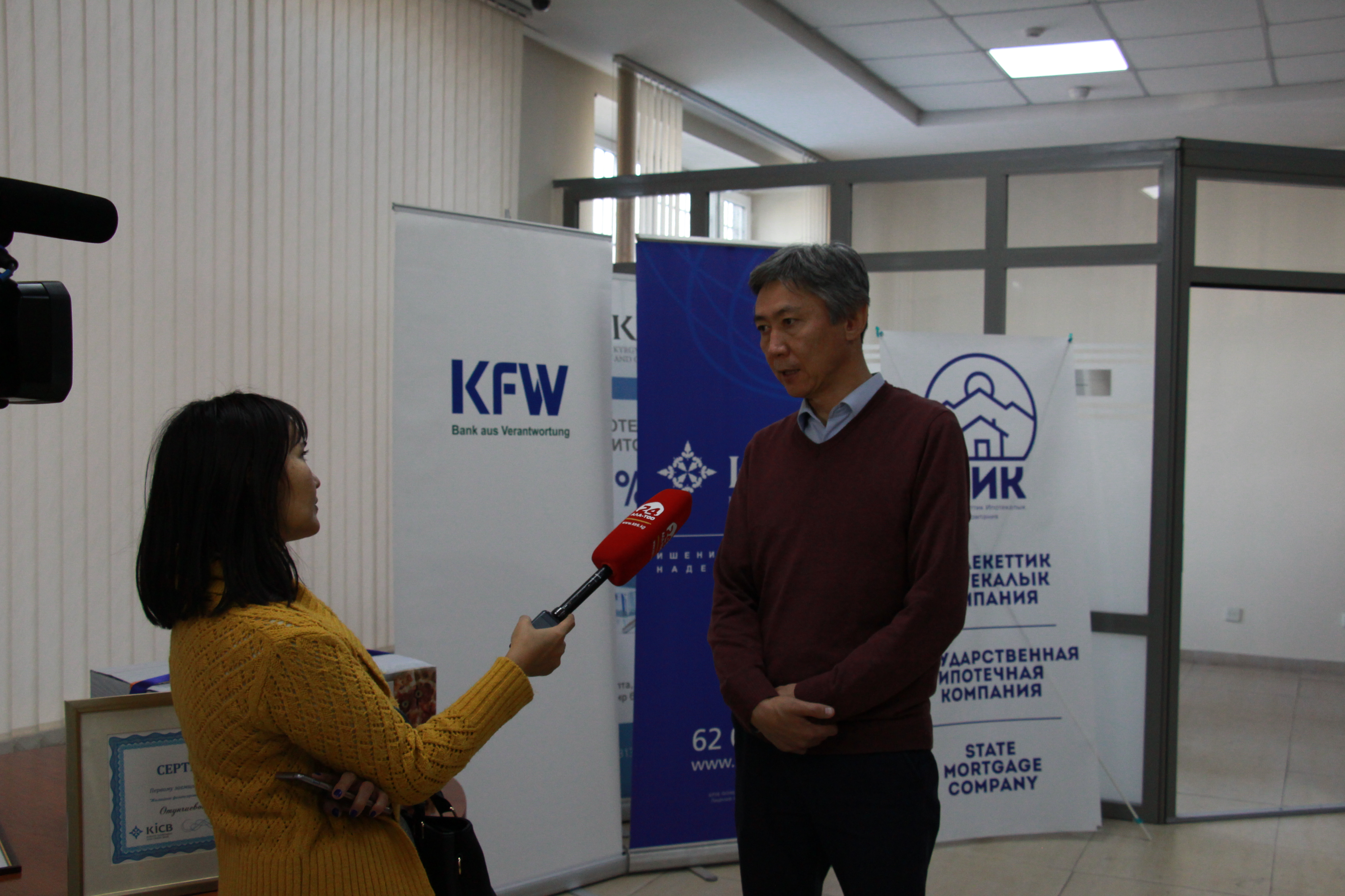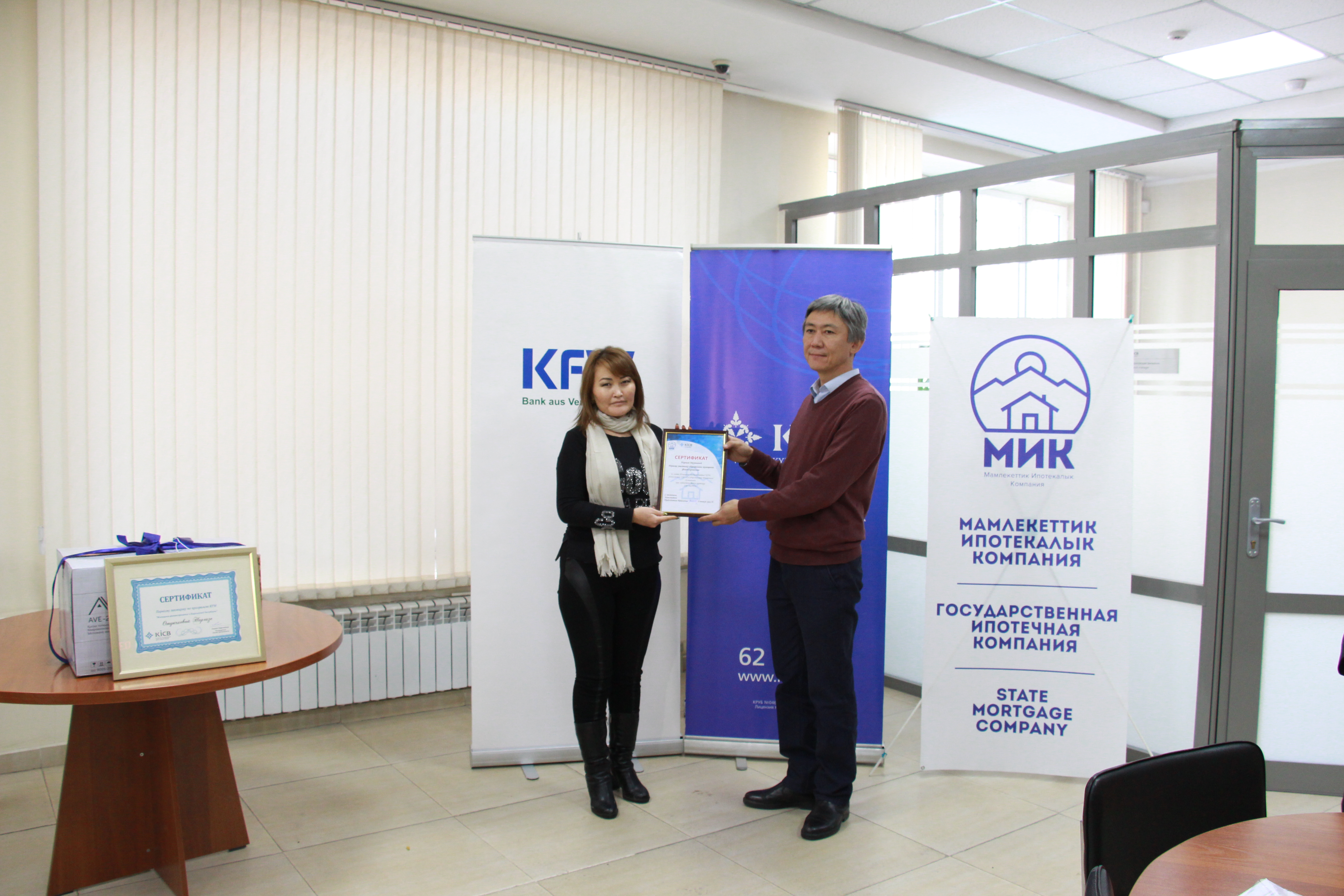 ОАО “ГИК” в лице заместителя Председателя Правления Нуржигит Усенакун уулу вручил “Сертификат” первого участника “Программы Жилищного Финансирования” по линии KFW Наргизе Отунчиевой, Представительство ЗАО “KiCB” подарили необходимый атрибут каждого дома-микроволновую печь.